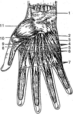 1 — удерживатель сгибателей; 2— мышца, отводящая мизинец; 3— короткий сгибатель мизинца; 4— сухожилия глубокого сгибателя пальцев; 5— мышца, противопоставляющая мизинец; 6— червеобразные мышцы; 7— сухожилия поверхностного сгибателя пальцев; 8— мышца, приводящая большой палец кисти; 9— сухожилие длинного сгибателя большого пальца кисти; 10 — короткий сгибатель большого пальца кисти; 11 — короткая мышца, отводящая большой палец кисти