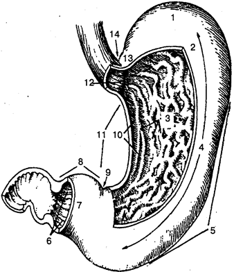 1 — дно желудка; 2 — передняя стенка; 3 — складки желудка; 4 — тело желудка; 5 — большая кривизна желудка; б— канал привратника; 7—привратниковая пещера; 8— привратниковая (пилорическая) часть; 9— угловая вырезка; 10— канал желудка; 11— малая кривизна желудка; 12 — кардиальное отверстие; 13— кардиальная часть желудка; 14 — кардиальная вырезка
