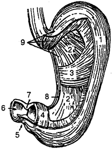 1,8— продольный слой; 2— косые волокна; 3, 4— круговой слой; 5— привратник; б— отверстие привратника; 7—сфинктер привратника; 9 — мышечная оболочка