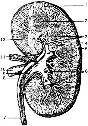 1 — корковое вещество; 2— мозговое вещество; 3— почечные сосочки; 4— почечные столбы; 5— фиброзная капсула; 6— малые почечные чашки; 7—мочеточник; 8— большая почечная чашка; 9 — почечная лоханка; 10— почечная вена; 11 — почечная артерия; 12— почечная пирамида