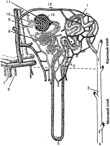 1 — дистальный извитой канадец; 2 — сеть капилляров; 3 — собирательная трубочка; 4 — движение мочи к почечной лоханке; 5 — петля Генле; 6 — почечная артерия; 7— почечная вена; 8— проксимальный извитой кана-лец; 9 — приносящая артериола; 10 — выносящая артериола; 11 — почечный клубочек; 12 — венула; 13 - боуменова капсула