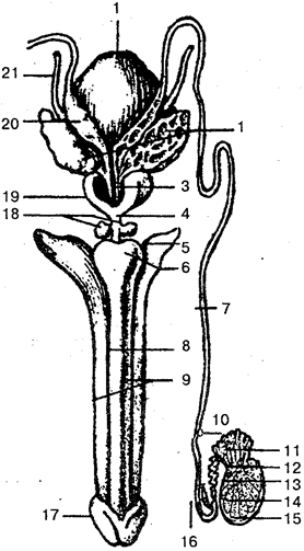1 — мочевой пузырь; 2 — семенной пузырек; 3 — се-мявыбрасывающий проток; 4— перепончатая часть уретры; 5 — ножка полового члена; 6— луковица полового члена; 7— семявыносящий проток; 8 — губчатое тело; 9 — пещеристое тело; 10 — придаток яичка; 11 — выносящие канальцы; 12— сетка яичка; 13 — прямые семенные канальцы; 14— извитые семенные канальцы; 15— белочная оболочка; 16— нижняя часть семявыносящего протока; 17— головка полового члена; 18— бульбоуретральная железа; 19— предстательная железа; 20 — ампула семявыносящего протока; 21— мочеточник
