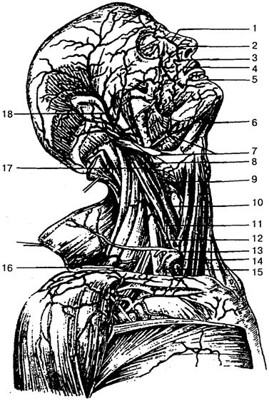 1 — тыльная артерия носа; 2 — подглазничная артерия; 3 — угловая артерия; 4 — верхняя губная артерия; 5 — нижняя губная артерия; б — подподбородочная артерия; 7— лицевая артерия; 8— язычная артерия; 9— верхняя щитовидная артерия; 10— общая сонная артерия; 11— нижняя щитовидная артерия; 12— поверхностная артерия шеи; 13 — щитошейный ствол; 14 — подключичная артерия; 15— надлопаточная артерия; /б—поперечная артерия шеи; 17— внутренняя сонная артерия; 18— поверхностная височная артерия