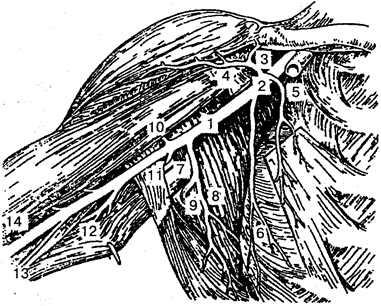 1— подмышечная артерия; 2 — грудо-акромиальная артерия; 3 — акромиальная ветвь; 4—дельтовидная ветвь; 5— грудные ветви; 6 — латеральная грудная артерия; 7— подлопаточная артерия; 8 — грудоспинная артерия; 9 — артерия, огибающая лопатку; 10 - передняя артерия, огибающая плечевую кость; 11 — задняя артерия, бающая плечевую кость; 12— глубокая артерия плеча; 13— верхняя тевая коллатеральная артерия; 14 — плечевая артерия