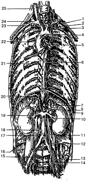 1 — левая общая сонная артерия; 2— левая подключичная артерия; 3 — внутренняя грудная артерия; 4 — дуга аорты; 5 — бронхиальные ветви; 6— нисходящая часть аорты; 7— чревный ствол; 8 — верхняя брыжеечная артерия; 9— диафрагма; 10 — брюшной отдел аорты; 11 — нижняя брыжеечная артерия; 12— общая подвздошная артерия; 13 — наружная подвздошная артерия; 14 — внутренняя подвздошная артерия; 15 — срединная крестцовая артерия; 16— подвздошно-пояснич-ная артерия; 17— поясничная артерия; 18— яичниковая артерия; 19— правая почечная артерия; 20— нижняя диафрагмальная артерия; 21 — межреберная артерия; 22 — восходящая часть аорты; 23 — плечеголовной ствол; 24 — правая подключичная артерия; 25— правая общая сонная артерия