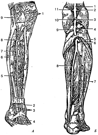 А — вид спереди: 1 — коленная суставная сеть; 2 — сухожилие передней большеберцовой мышцы; 3 — сухожилие длинного разгибателя пальцев; 4 — тыльная артерия стопы; 5 — длинный разгибатель большого пальца; 6 — длинная малоберцовая мышца; 7— длинный разгибатель пальцев; 8 — передняя большеберцовая артерия; 9 — сумка коленного сустава; Б — вид сзади: 1 — подколенная артерия; 2 — латеральная верхняя коленная артерия; 3, 10 — икроножные артерии; 4 — латеральная нижняя коленная артерия; 5 — задняя большеберцовая возвратная артерия; 6 — передняя большеберцовая артерия; 7— малоберцовая артерия; 8— задняя большеберцовая артерия; 9 — медиальная нижняя коленная артерия; 11 — медиальная верхняя коленная артерия