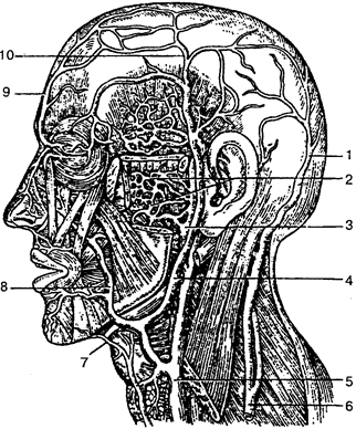 1 — затылочная вена; 2 — крыловидное (венозное) сплетение; 3 — верхнечелюстная вена; 4 — занижнечелюстная вена; 5 — внутренняя яремная вена; 6 — наружная яремная вена; 7 — подбородочная вена; 8 — лицевая вена; 9 — лобная вена; 10— поверхностная височная вена