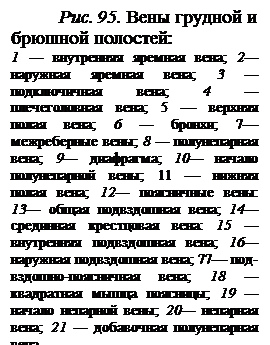 На уровне наружного края I ребра подмышечная вена переходит в подключичную. К ней присоединяются непостоянная поперечная вена шеи, подлопаточная вена, а также мелкие грудные и дорсальная лопаточная вена. Место слияния подключичной вены с внутренней яремной веной с каждой стороны называется венозным углом. В результате этого соединения формируются плечеголовные вены, куда впадают вены тимуса, средостения, околосердечной сумки, пищевода, трахеи, мышц шеи, спинного мозга и др. Далее, соединившись, плечеголовные вены образуют основной ствол — верхнюю полую вену. К ней присоединяются вены средостения, околосердечной сумки и непарная вена, которая является продолжением правой восходящей поясничной вены. Непарная вена собирает кровь от стенок брюшной и грудной полостей (рис. 95). В непарную вену впадает полунепарная вена, к которой присоединяются вены пищевода, средостения, частично задние межреберные вены; они являются продолжением левой восходящей поясничной вены.