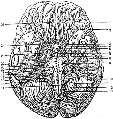 1 — обонятельная луковица; 2 — обонятельный тракт; 3 — переднее продырявленное вещество; 4 — серый бугор; 5— зрительный тракт; 6— сосцевидные тела; 7 — тройничный узел; 8 — заднее продырявленное вещество; 9— мост; 10— мозжечок; 11— пирамида продолговатого мозга; 12— олива; 13 — спинномозговые нервы; 14 — подъязычный нерв; 15 — добавочный нерв; 16— блуждающий нерв; 17— языкоглоточный нерв; 18— преддверно-улитковый нерв; 19 — лицевой нерв; 20 — отводящий нерв; 21 — тройничный нерв; 22 — блоковый нерв; 23 — глазодвигательный нерв; 24 — зрительный нерв; 25 — обонятельные нервы