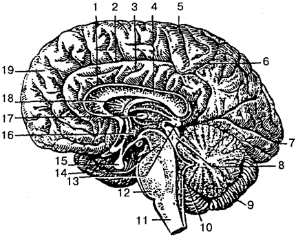 1 — борозда мозолистого тела; 2 — поясная борозда; 3 — поясная извилина; 4— мозолистое тело; 5— центральная борозда; 6— парацентральная долька; 7— шпорная борозда; 8— пластинка крыши (четверохолмия); 9 — мозжечок; 10 — IV желудочек; 11 — продолговатый мозг; 12 — мост; 13 — шишковидное тело (эпифиз); 14— ножки мозга; 15— гипофиз; 16— III желудочек; 17—межталамическое сращение; 18 — прозрачная перего-родка; 19 — верхняя лобная извилина