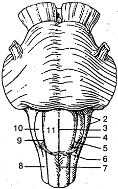 1 — продолговатый мозг; 2 — позадио-ливное поле; 3— передняя срединная щель; 4 — позадиоливная борозда; 5,9— переднелатеральная борозда; 6— передние наружные дугообразные волокна; 7— перекрест пирамид; 8— боковой канатик; 10— олива; 11 — пирамида продолговатого мозга