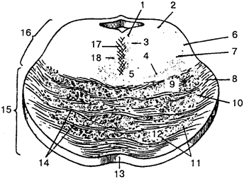 1 — задний продольный пучок; 2 — среднемозговой путь тройничного нерва; 3— медиальный продольный пучок; 4 — медиальная петля; 5— ретикулярная формация; 6— тройничная петля (тройнично-таламический путь); 7— спинномозговая петля; 8— мостомозжечковые волокна; 9— корково-ядерные волокна; 10— корково-мостовые волокна; 11 — ядра моста; /2—корково-спинномозговые волокна; 13 — базилярная борозда; 14 — поперечные волокна моста; 15 — передняя (базилярная) часть моста; 16 — задняя часть моста (покрышка моста); / 7—шов моста; 18— покрышечно-спинномозговой путь