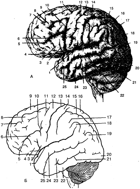 А, Б: 1 — латеральная борозда; 2 — покрышечная часть нижней лобной извилины; 3 — треугольная часть нижней лобной извилины; 4— глазничная часть нижней лобной извилины; 5— нижняя лобная борозда; 6 — нижняя лобная извилина; 7—верхняя лобная борозда; 8— средняя лобная извилина; 8— верхняя лобная извилина; 10— нижняя предцентральная борозда; 11 — верхняя предцентральная борозда; 12 — пред-центральная извилина; 13 — центральная борозда; 14 — постцентральная борозда; 15 — внутритеменная борозда; 16 — верхняя теменная долька; 17 — нижняя теменная долька; 18— надкраевая извилина; 19— угловая извилина; 20 — затылочный полюс; 21 — нижняя височная борозда; 22 — верхняя височная извилина; 23 — средняя височная извилина; 24— нижняя височная извилина; 25— верхняя височная борозда