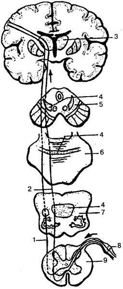 1 — латеральный спинно-таламический путь; 2 — передний спинно-таламический путь; 3 —зрительный бугор; 4— медиальная петля; 5— поперечный срез среднего мозга; 6 — поперечный срез моста; 7 — поперечный срез продолговатого мозга; 8 — спинномозговой узел; 9 — поперечный срез спинного мозга