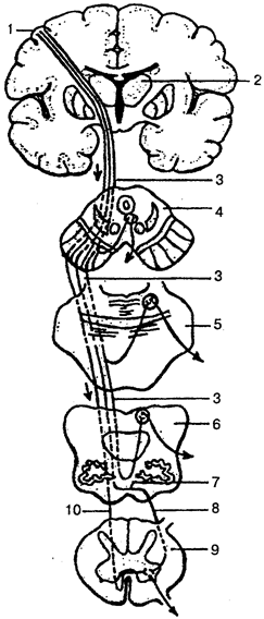 1 — предцентральная извилина; 2 — зрительный бугор; 3 — корково-ядерный путь; 4 — поперечный срез среднего мозга; 5 — поперечный срез моста; 6— поперечный срез продолговатого мозга; 7— перекрест пирамид; 8 — латеральный корково-спинномозговой (пирамидный) путь; 9— поперечный срез спинного мозга; 10— передний корково-спинномозговой (пирамидный) путь