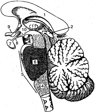 1 - мозолистое тело; 2— шишковидное тело (эпифиз); 3 — мозжечок; 4 — продолговатый мозг; 5 - ромбовидный мозг; 6— мост; 7— гипофиз; 8— воронка; 9— зрительный перекрест; 10 - гипоталамус; 11 — межгаламическое сращение