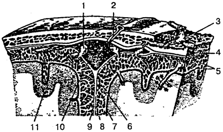 1 - грануляция паутинной оболочки; 2— эмиссарная вена; 3— вена губчатого вещества кости; 4 — твердая мозговая оболочка; 5 — перекладины паутинной оболочки; 6 — подпаугинное пространство; 7—сосудистая оболочка; 8 — паутинная оболочка; 9 — серп большого мозга; 10 — верхний сагиттальный синус; 11 — кора большого мозга