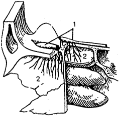 2) барабанную струну — смешанный нерв, отходит от лицевого нерва через ба-рабаннокаменистую щель и идет вперед и вниз до соединения с язычным нервом. Нерв содержит афферентные вкусовые волокна от передней части языка и парасимпатические слюноотделительные волокна к подъязычной и подчелюстной слюнным железам; 3) стременной нерв — двигательный нерв, иннервирует стременную мышцу барабанной полости.