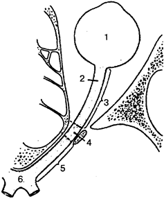 1 — глазное яблоко; 2 — зрительный нерв; 3 — глазничная часть; 4 — внутри-канальцевая часть; 5 — внутричерепная часть; 6 — зрительный перекрест