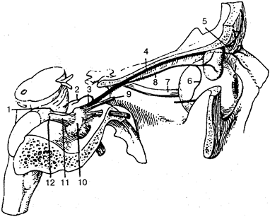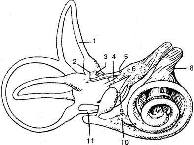 1 — полукружные каналы; 2 — латеральный ампулярный нерв; 3 — передний ампулярный нерв; 4— эллиптически-мешотчатый нерв; 5— эллиптически-мешотчато-ампулярный нерв; 6— преддверный узел; 7— преддверный нерв; 8 — улитковый нерв; 9 — сферически-мешотчатый нерв; 10 — улитковый узел (спиральный узел улитки); 11— задний ампулярный нерв