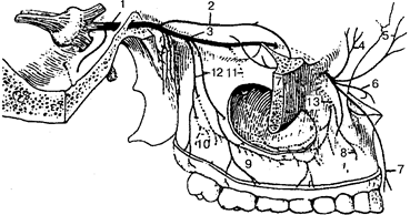 1 — верхнечелюстной нерв; 2 — скуловой нерв; 3 — подглазничный нерв; 4— нижние ветви век; 5— наружные носовые ветви; 6— внутренние носовые ветви; 7— верхние губные ветви; 8 — верхние зубные ветви; 9 — верхние десневые ветви; 10 — верхнее зубное сплетение; 11 — средняя верхняя альвеолярная ветвь; 12 — задние верхние альвеолярные ветви; 13 — передние верхние альвеолярные ветви