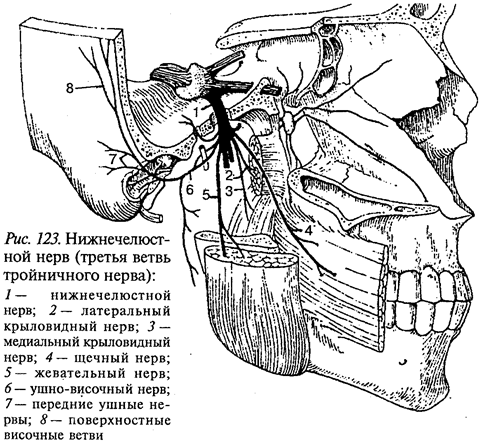 Третья ветвь, нижнечелюстной нерв (рис. 123), выходит из черепа через овальное отверстие и делится на ряд двигательных ветвей ко всем жевательным мышцам, челюстно-подъязычной мышце, напрягающей нёбную занавеску, и к мышце, напрягающей барабанную перепонку. Кроме того, нижнечелюстной нерв отдает ряд чувствительных ветвей, в том числе крупных: язычный и нижний альвеолярный нервы; более мелкие нервы (щечный, ушно-височный, менингеальная ветвь). Последние иннервируют кожу и слизистую оболочку щек, часть ушной раковины, наружного слухового прохода, барабанную перепонку, кожу височной области, околоушную слюнную железу, оболочку головного мозга.