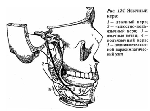 Язычный нерв (рис. 124) воспринимает общую чувствительность слизистой оболочки (боль, прикосновение, температура) с 2/3 части языка и слизистой оболочки рта.