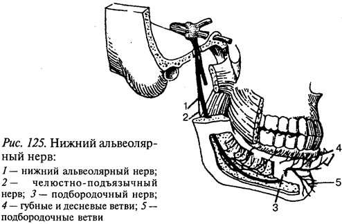 Нижний альвеолярный нерв (рис. 125) самый крупный изо всех ветвей нижнечелюстного нерва, входит в канал нижней челюсти, иннервирует зубы и десны нижней челюсти и, пройдя через подбородочное отверстие, иннервирует кожу подбородка и нижней губы.