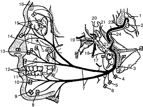 1— дно IV желудочка; 2 - ядро лицевого нерва; 3 — шилососцевидное отверстие; 4— ветвь к задней ушной мышце; 5— ветвь к заднему брюшку двубрюшной мышцы; 6—ветвь к шилоподъязычной мышце; 7—ветви лицевого нерва к мимическим мышцам и подкожной мышце шеи; 8 — ветвь к мышце, опускающей угол рта; 9 — ветвь к подбородочной мышце; 10 — ветвь к мышце, опускающей нижнюю губу; 11 — ветвь к щечной мышце; 12 — ветвь к круговой мышце рта; 13 — ветвь к мышце, поднимающей верхнюю губу; 14 — ветвь к скуловой мышце; 15 — ветви к круговой мышце глаза; 16— ветви к лобному брюшку надчерепной мышцы; 17— барабанная струна; 18— язычный нерв; 19— крылонёбный узел; 20 — тройничный узел; 21 — внутренняя сонная артерия; 22 — промежуточный нерв; 23 — лицевой нерв; 24 — преддверно-улитковый нерв