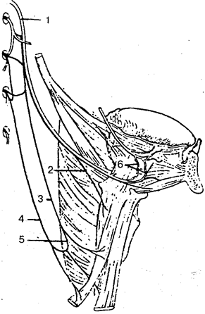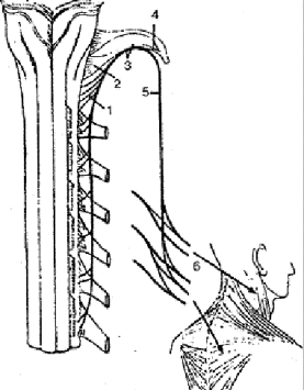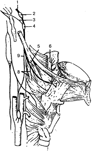 1 — спинномозговые корешки; 1 — черепные корешки (блуждающая часть);.У—ствол добавочного нерва; 4— внутренняя ветвь; 5 — наружная ветвь; 6— мышечные ветви