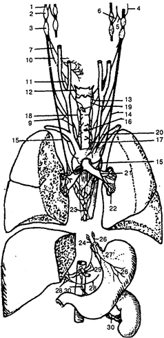 1 — блуждающий нерв; 2 — верхний узел; 3 — нижний узел; 4— менингеальная ветвь; J— ушная ветвь; 6 — соединительная ветвь; 7 — глоточные ветви; S — глоточное сплетение; 9 — верхние шейные сердечные ветви; 10 — верхний гортанный нерв; 11 — наружная ветвь; 12 — внутренняя ветвь; 13 — соединительная ветвь с возвратным гортанным нервом; 14 — нижние шейные сердечные ветви; 15— возвратный гортанный нерв; 16— трахеальные ветви; 17— пищеводные ветви; 18— нижний гортанный нерв; 79— соединительная ветвь с внутренней гортанной ветвью; 20— грудные сердечные ветви; 21 — бронхиальные ветви; 22 —легочное сплетение; 23 — пищеводное сплетение; 24 — передний блуждающий ствол; 25— задний блуждающий ствол; 26— передние желудочные ветви; 27 — задние желудочные ветви; 28 — печеночные ветви; 2° — чревные ветви; 30— почечные ветви