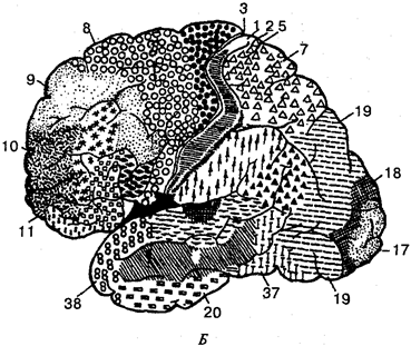 А - латеральная поверхность; Б - медиальная поверхность; числа - корковые поля