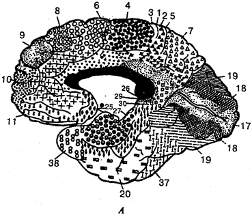 Так, в соответствии с цитоархитектоническими картами полушарий большого мозга у человека можно определить корковые концы различных анализаторов (ядер) относительно извилин и долей полушарий (рис. 141).