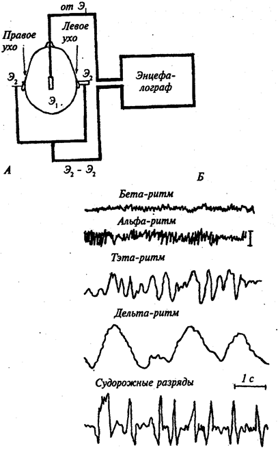 А — схема регистрации ЭЭГ; Б — основные ритмы ЭЭГ; Э1 — активный электрод; Э2 — индифферентные электроды