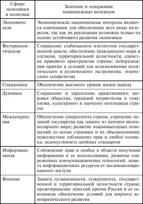 Обеспечение национальной безопасности и национальных интересов России осуществляется в политической, экономической, гуманитарной и военной областях. Оно тесно связано с местом России в системе глобальных военно–политических отношений, которые характеризуются сегодня сочетанием двух основных тенденций. С одной стороны, наблюдается стремление сформировать новую, более справедливую и демократичную систему международных экономических и политических отношений. С другой стороны, расширяется практика применения вооруженной силы на основании национальных решений вне мандата ООН.