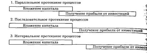 Для вложений в реальные активы в основном характерно интервальное протекание рассматриваемых инвестиционных процессов. Последовательное и параллельное протекание процессов вложения капитала и получения прибыли может происходить преимущественно при инвестировании в финансовые активы, а также при капиталовложениях в техническое перевооружение, реконструкцию и расширение действующих производств. Очевидно, что от временной последовательности протекания процессов вложения капитала и получения прибыли зависит оборачиваемость инвестиционных ресурсов, обеспечение ликвидности активов, возможность оперативного управления оборотными средствами и в целом эффективность инвестиционной деятельности.