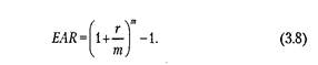 В ходе анализа эффективности нескольких инвестиционных проектов с различными интервалами наращения капитала необходимо использовать обобщающий финансовый показатель, позволяющий осуществлять их сравнительную оценку. Таким показателем является эффективная годовая процентная ставка (EAR), которая обеспечивает переход от PV к FV при заданных значениях их величин. Этот темп прироста капитала является универсальным для любой системы начислений и рассчитывается по формуле: