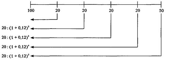 Пример. Фирме предложено инвестировать 100 тыс. ден. ед. на срок 5 лет при условии возврата в конце каждого года по 20 тыс. ден. ед. и выплате дополнительного вознаграждения в конце пятого года в размере 30 тыс. ден. ед. Стоит ли принимать это предложение, если свободные денежные средства фирма в настоящее время размещает на банковском депозите под 12% годовых?