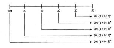PV= 20: (1 + 0,12)1 + 20: (1 + 0,12)2 + 20: (1 + 0,12)3 + 20: (1 + 0,12)4+ +50: (1 + 0,12)5 = 17,86 + 15,94 + 14,24 + 12,72 + 28,35 = + 89,11 (тыс. ден. ед.).