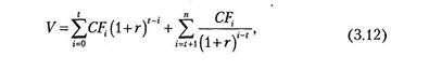 Иногда в инвестиционном анализе может быть применен и третий подход к обеспечению сопоставимости разновременных денежных потоков. Он состоит в том, что все затраты и результаты приводятся к определенному моменту времени внутри рассматриваемого периода, который, будучи промежуточным, представляет интерес для инвесторов и аналитиков. В качестве такого момента, например, может быть выбран момент начала эксплуатации будущего проектного решения. Формула для расчета суммы сопоставимых денежных потоков для этого варианта имеет вид