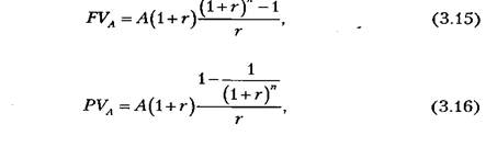 В практической деятельности коммерческих организаций возможна ситуация, когда поступления или оттоки денежных средств происходят в начале каждого периода (например, лизинговые платежи). В таком случае речь идет об аннуитете, осуществляемом на основе потоков пренумерандо, иногда его называют авансовым аннуитетом. Для такой модели денежных потоков текущая и будущая стоимость аннуитета рассчитываются по формулам