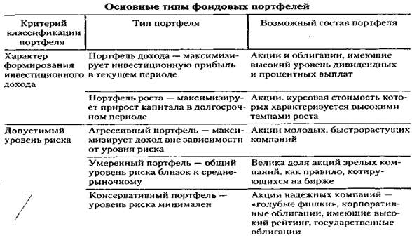 Основные типы фондовых портфелей и примерный состав каждого из них представлены в таблице.
