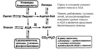 | Рис. 7. Пути (I и II) восполнения и формирования резерва 2-углеродных эквивалентов (по Ю. Островскому) как альтернатива потреблению алкоголя или снятию влечения к алкоголю медикаментозными методами |