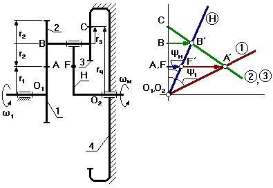От вертикали до линии распределения скоростей по водилу измеряем угол ψн, а от вертикали до линии распределения скоростей по колесу 1 измеряем угол ψ1. Т.к. углы ψ1 и ψн отложены от вертикали в одном направлении, то это показывает, что входное звено 1 и выходное звено вращаются в одном направлении.