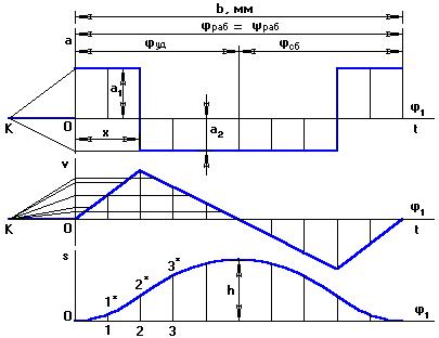 Затем в первом приближении принимаем, что кулачок вращается равномерно, тогда угол поворота кулачка пропорционален времени поворота, и оси φ и t совпадают, но каждая ось имеет свой масштаб.