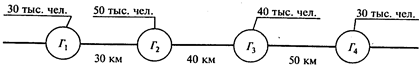 Две конкурирующие крупные торговые фирмы Ф1 и Ф2 планируют построить в одном из четырех небольших городов Г 1, Г 2, Г 3 и Г 4, лежащих вдоль автомагистрали, по одному универсаму. Взаимное расположение городов, расстояние между ними и численность населения показаны на рисунке 1.