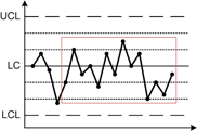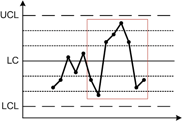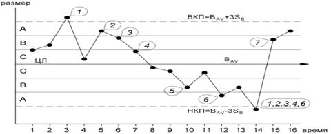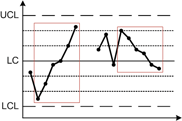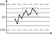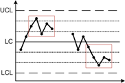 6 Две из трех последовательных точек лежат в крайней трети диапазона контрольных пределов (рисунок 11).