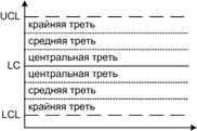 Контрольная карта строится на специальном бланке, на котором наносятся оси координат: по горизонтали – время, по вертикали – контролируемый параметр. На контрольной карте отмечаются также горизонтальные линии, определяющие верхнюю и нижнюю границы допуска регулируемого параметра, и центральная горизонтальная линия, соответствующая оптимальному значению параметра. Часто расстояние от средней (центральной линии) до верхней и нижней контрольных границ делиться на 3 части (см рисунок 4).
