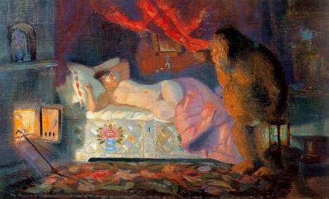 | «Схватила его за лапу мохнатую – и видит, что зверь лесной, чудо морское, бездыханен, мертв лежит... Помутилися ее очи ясные, подкосилися ноги резвые, пала она на колени, обняла руками белыми голову своего господина доброго, голову безобразную и противную, и завопила истошным голосом: «Ты встань, пробудись, мой сердечный Друг, я люблю тебя как жениха желанного!..» С.Т. Аксаков. «Аленький цветочек» |