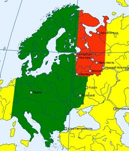 Граница проходила чуть западнее Новгорода и Смоленска с юга на север, оставляя (будущий) Петербург западнее, и шла в том же направлении далее на север западнее Мурманска, который возник много позже, но с учетом существовавших до того границ. Лежат все эти города почти на одной географической долготе. В северной части почти так же (позже ее отодвинули чуть западнее) проходит современная граница с Финляндией.